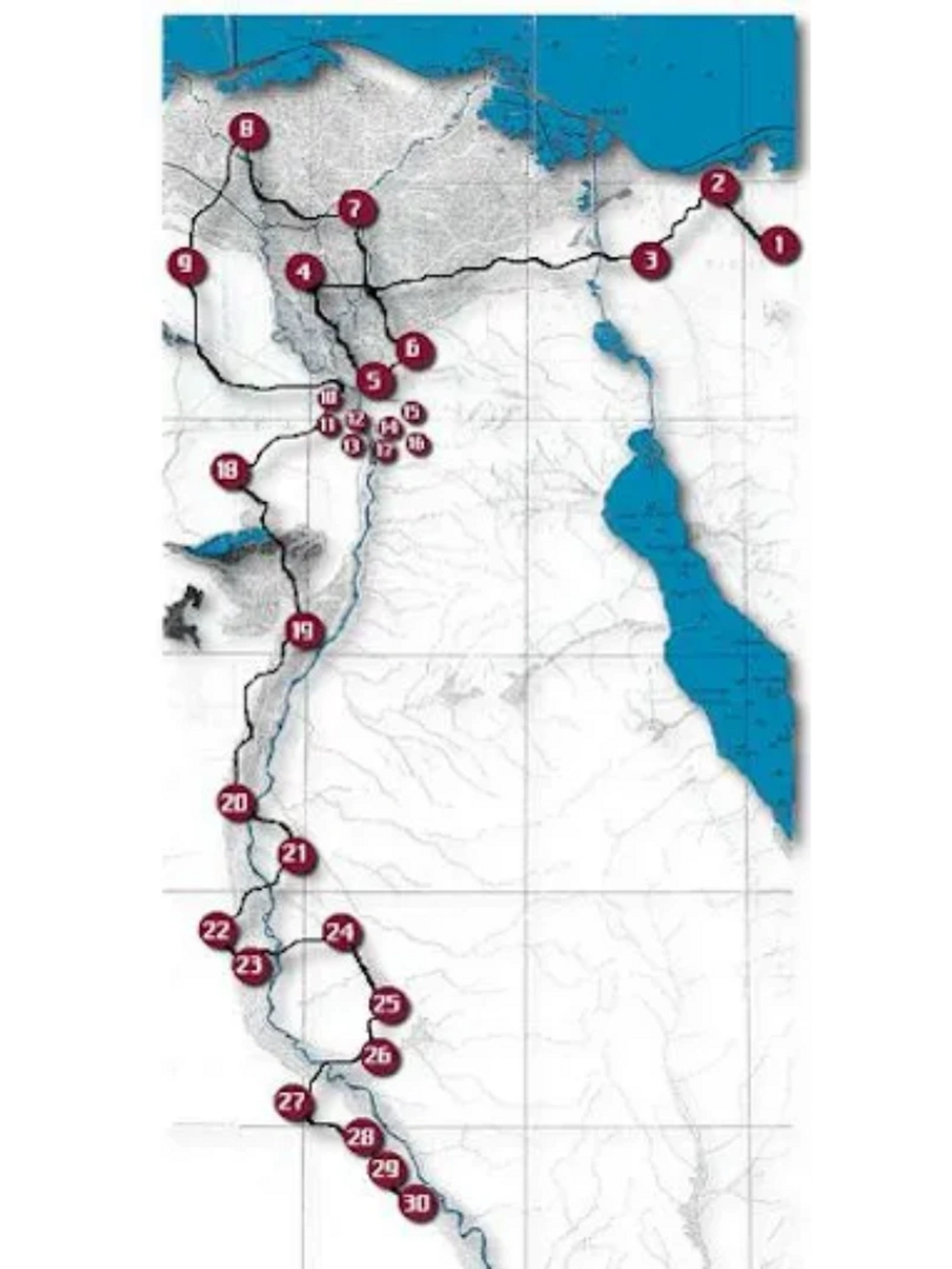 1. Rafah 2. Al-Arish 3. Farma 4. Tal Basta5. Mostorod 6. Belbeis 7. Me niet Samanoud 8. Sakha 9. Wadi El-Natroun 10. Ain Shams 11. Matareya 12. Zeitoun 13. Zeweila Alley 14. El-Ezbaweya 15. The area of Old Cairo 16. Babylon 17. Maady 18. Ashnein: El-Nasara & El-Garnous Monastery 19. Bahnassa 20. Samalout 21. Gabal al Tair 22. Hermapolis: Al-Ashmounein Town - Mallawy 23. Daurout Um Makhla 24. Beer El-Sahaba 25. Kom Maria 26. Tal El-Amarna 27. Daurout 28. Qoussia 29. Meir30. Monastery Of Moharraq